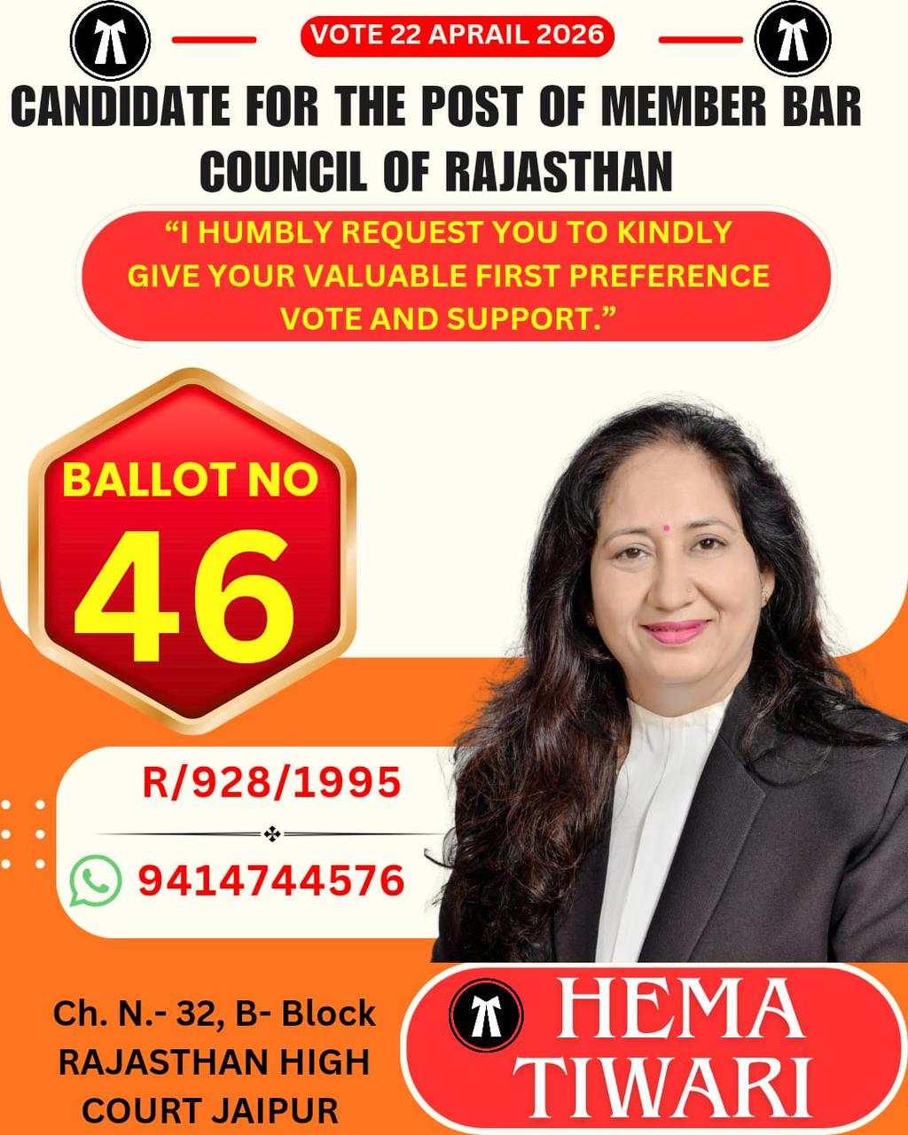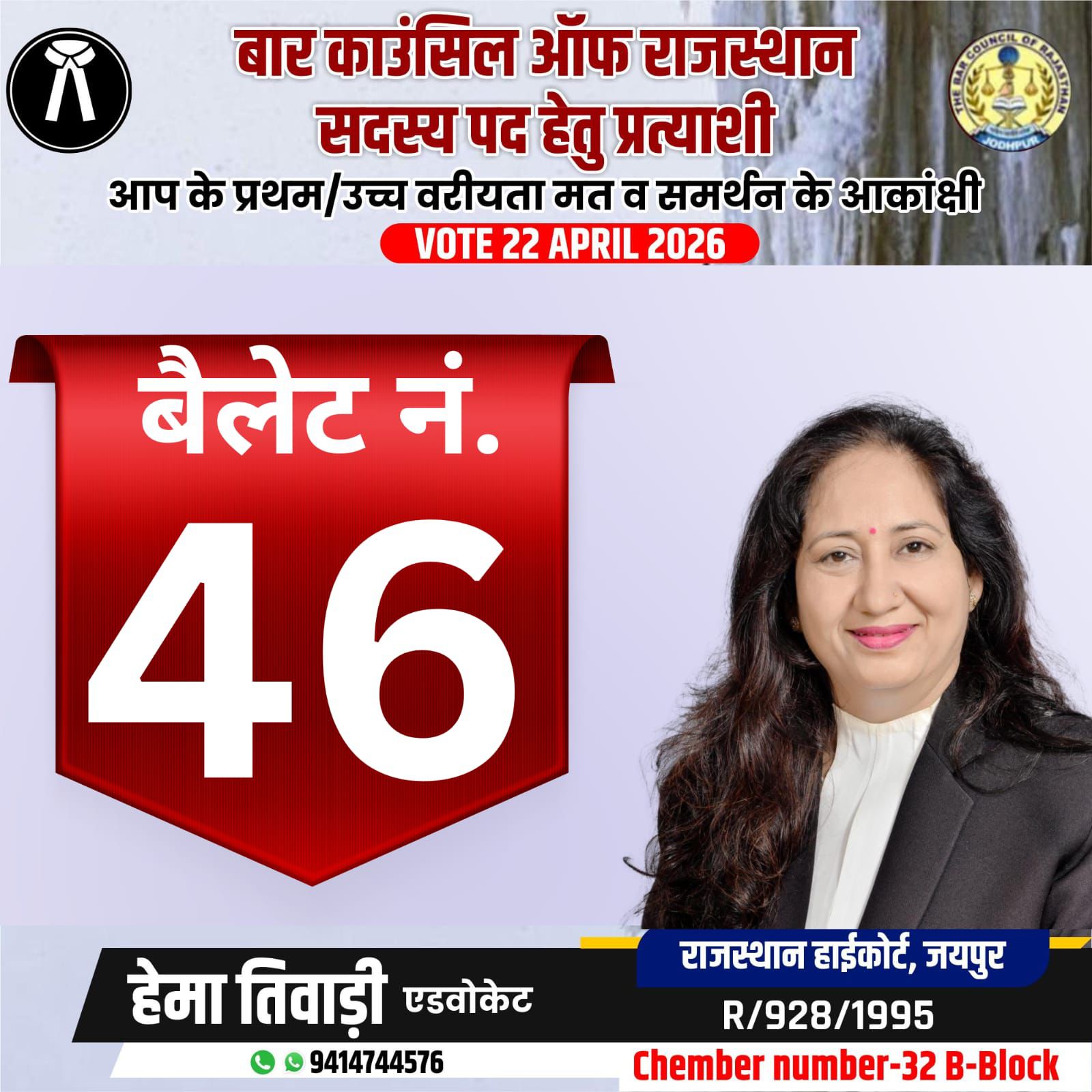 मैं एडवोकेट हेमा तिवारी, बार कौंसिल ऑफ राजस्थान के आगामी चुनाव में सदस्य पद हेतु प्रत्याशी हूं। आप मुझे 22 april को बैलेट नंबर 46 पर प्रथम/ उच्चतम वरीयता का वोट देकर सहयोग करने की कृपा करें।